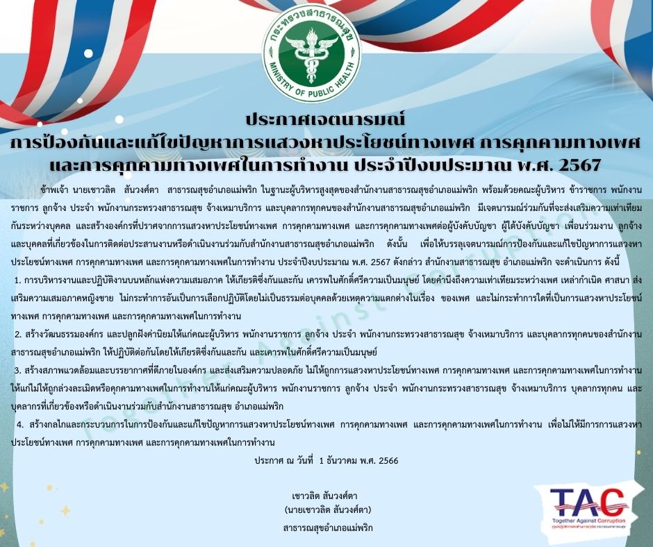 ประกาศเจตนารมณ์ การป้องกันและแก้ไขปัญหาการแสวงหาประโยชน์ทางเพศ การคุกคามทางเพศ และการคุกคามทางเพศในการทำงาน ประจำปี 2567 Posted on 25/12/2023Posted in ข่าวประชาสัมพันธ์ Post navigation ประกาศเจตนารมณ์การต่อต้านการทุจริต ประจำปีงบประมาณ 2567ประกาศเจตนารมณ์ นโยบายไม่รับของขวัญและของกำนัลทุกชนิดจากการปฏิบัติหน้าที่(No Gift Policy) ประจำปี 2567 Leave a ReplyYour email address will not be published. Required fields are marked *Comment * Name Email Website